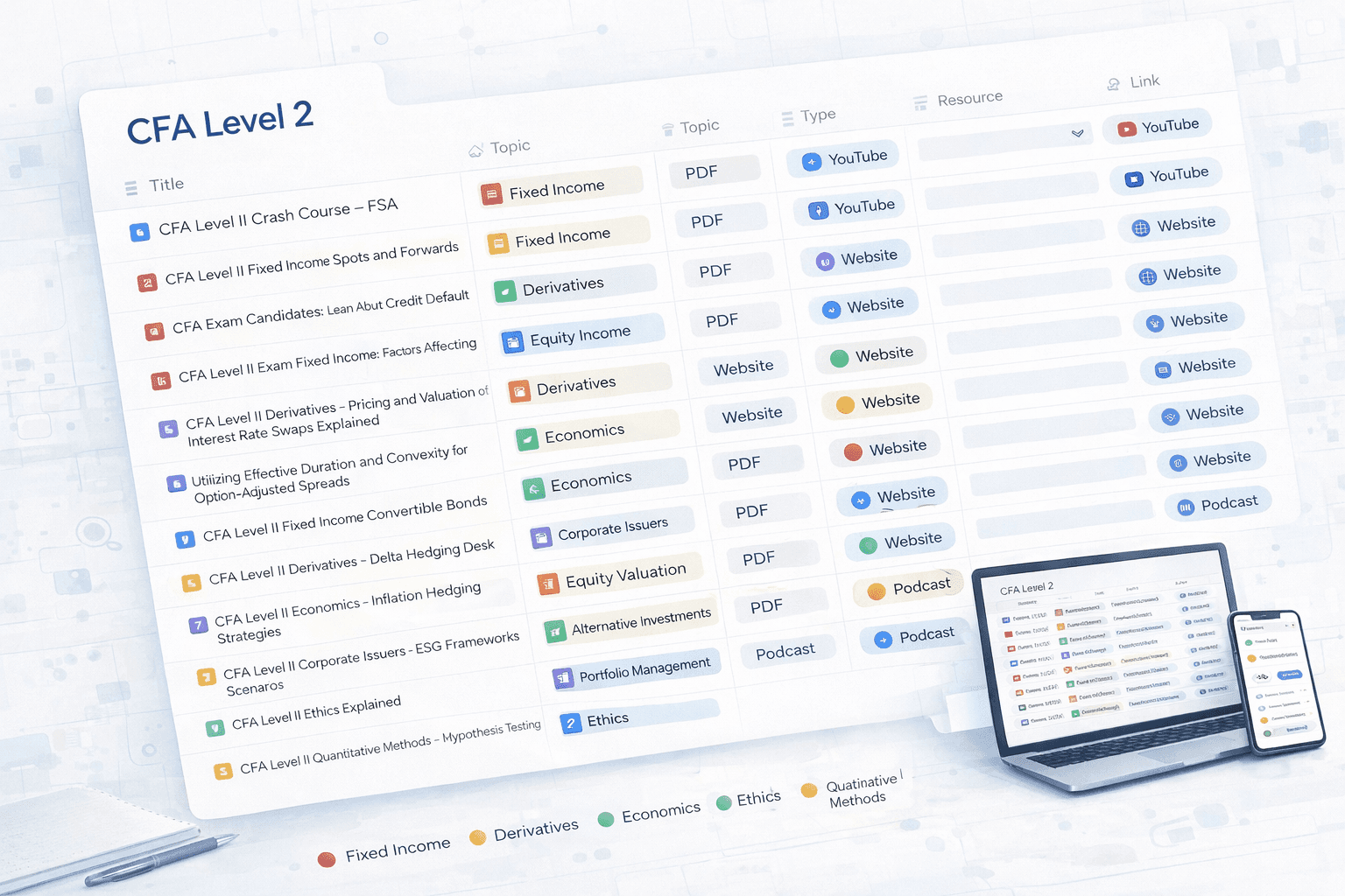 Aquí encontrarás centenares de recursos disponibles en internet para estudiar el CFA. Desde pdfs hasta videos de youtube, filtrados por tema, dificultad y grado de recomendación.